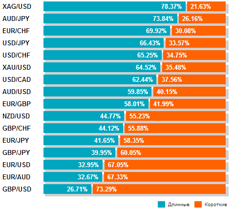 Соотношения длинных и коротких позиций. Показывает отношение длинных позиций к коротким для каждой из основных валютных пар. Процент слева обозначает длинные позиции; процент справа — короткие позиции.
